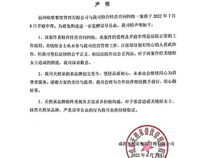 聲明顯示,溫州歐歌餐飲管理有限公司與成都天然呆餐飲管理有限公司(以下簡稱“天然呆餐飲”)特許經(jīng)營合同糾紛一案將于2022年7月8日開庭審理。