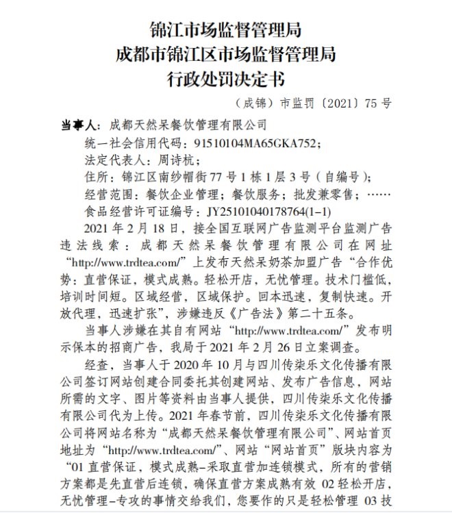 天眼查顯示,2021年3月,天然呆因在招商廣告中發(fā)布“回本迅速,復(fù)制快速-迅速回收成本,助您快速積累資金與運營經(jīng)驗,同步積累客戶,快速復(fù)制新店”的內(nèi)容系在招商廣告中明示保本的行為,違法《廣告法》被錦江市場監(jiān)督管理局罰款5萬元。