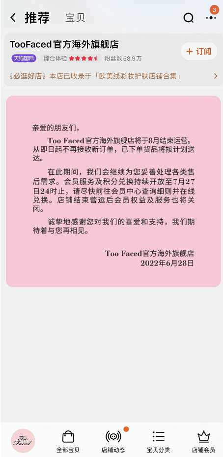 6月28日,天貓國際Too Faced官方海外旗艦店內(nèi)發(fā)布一則公告稱:店鋪將于8月結(jié)束運營,即日起不再接收新訂單,已下單的貨品將按計劃送達。會員服務和積分兌換將持續(xù)開放至7月27日。店鋪結(jié)束運營后,會員權(quán)益及服務也將關(guān)閉。