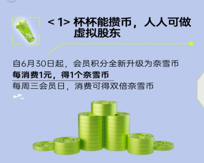 6月30日,奈雪的茶官方微信公眾號(hào)宣布,會(huì)員中心升級(jí),6月30日起,每消費(fèi)1元即可得1個(gè)奈雪幣,每周三會(huì)員日,消費(fèi)可得雙倍奈雪幣。會(huì)員可使用奈雪幣買入/賣出虛擬股票,成為虛擬股東,也可以在奈雪幣商城使用奈雪幣兌換各種禮品,此外每30股虛擬股票可兌換3元代金券。