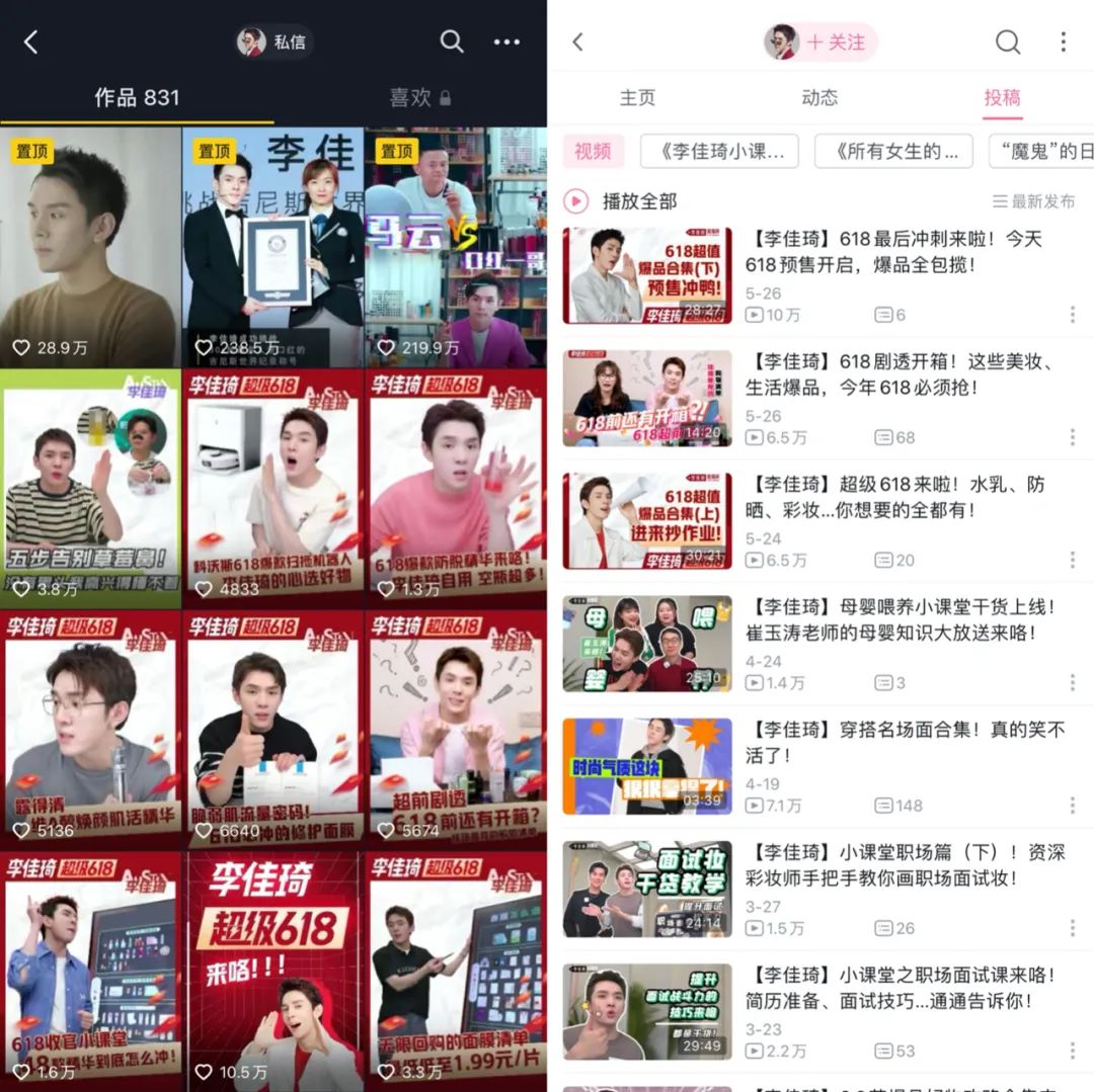 李佳琦的抖音和B站賬號(hào)主頁(yè)