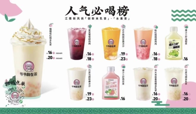 肯德基旗下的爺爺自在茶做出了新物種“米乳茶”,但大部分飲品都是復(fù)制新茶飲以往的爆款產(chǎn)品,仍然缺乏競(jìng)爭(zhēng)力。