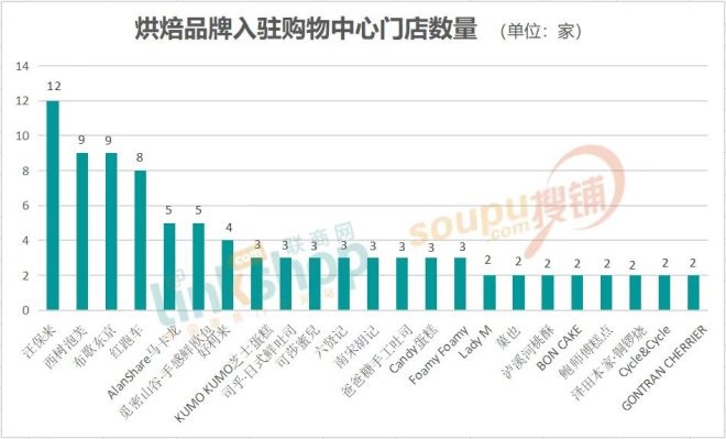 注:該圖表僅統(tǒng)計數(shù)量≥2的烘焙品牌,未選入的烘焙品牌在杭主要購物中心門店數(shù)量均為1家。