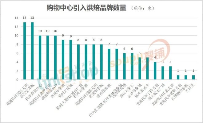 統(tǒng)計發(fā)現(xiàn),龍湖杭州濱江天街、濱江寶龍城分別以13家并列排名第一,杭州嘉里中心、龍湖杭州金沙天街、湖濱銀泰in77以10家并列排名第二。