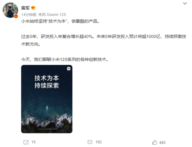 7月1日,小米董事長(zhǎng)兼CEO雷軍在個(gè)人微博表示,過(guò)去5年,研發(fā)投入年復(fù)合增長(zhǎng)超40%。未來(lái)5年研發(fā)投入預(yù)計(jì)將超1000億,持續(xù)探索技術(shù)新方向。