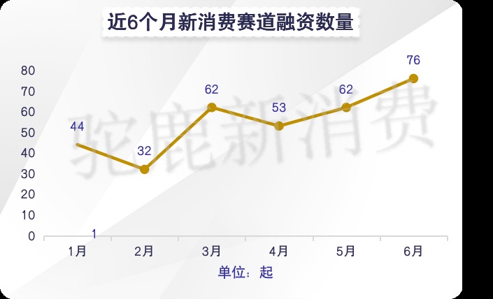 在融資數量方面,6月份新消費賽道有多達76個品牌獲得融資,也創(chuàng)下近六個月以來的最高。