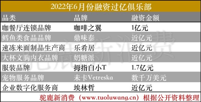 以下是駝鹿新消費獨家整理發(fā)布的2022年6月份新消費賽道的詳細融資情況和相關數據解讀: