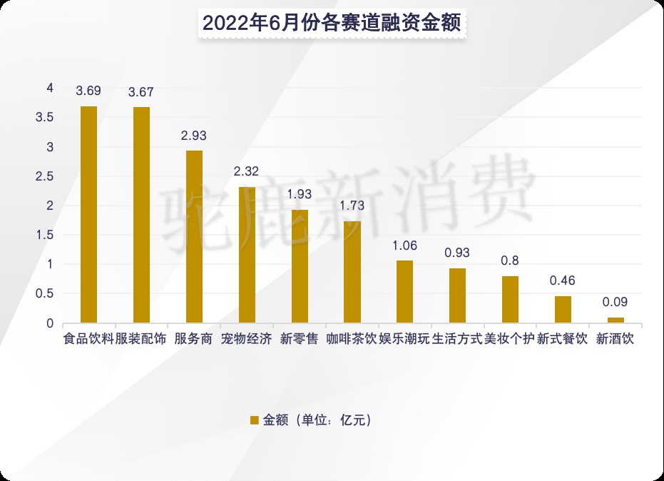 從細分賽道來看,食品飲料、服裝配飾賽道成為6月份最為吸金的兩大賽道,分別獲得3.69億元、3.67億元人民幣融資。受疫情等因素影響,在整個大消費板塊震蕩下,食品飲料和服裝配飾成為消費賽道投資人最為看好的確定性品類。