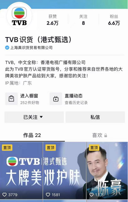 今年年初,《識(shí)貨》播出第二季。4月,TVB也開(kāi)通了第二個(gè)賬號(hào)——TVB識(shí)貨(港式甄選)。這次,TVB顯然更加有經(jīng)驗(yàn),不僅將賬號(hào)定位在分享和推薦美妝護(hù)膚產(chǎn)品,更不斷安排旗下藝人出面,以吸引更多粉絲的關(guān)注,包括陳自瑤、陳敏之等當(dāng)紅藝人均已亮相分享產(chǎn)品。目前,注冊(cè)2個(gè)多月的TVB識(shí)貨(港式甄選)粉絲數(shù)為6.6萬(wàn),櫥窗上架252件商品,已經(jīng)有7408人下單。