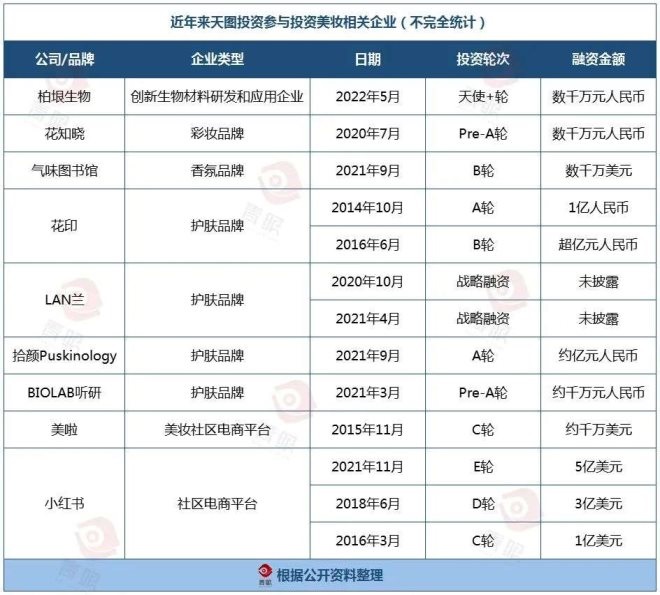 據(jù)公開資料不完全統(tǒng)計,近年來,天圖投資共投資了10來家美妝上游、中游、下游相關(guān)企業(yè),覆蓋美妝全產(chǎn)業(yè)鏈條。