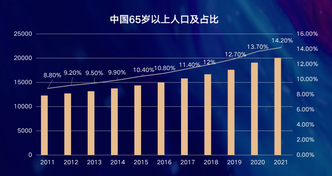 按照國際通行劃分標準,當一個國家或地區(qū)65歲及以上人口占比超過7%時,意味著進入老齡化;達到14%,為深度老齡化;超過20%,則進入超老齡化社會。按照這個標準,2021年,我國已經(jīng)進入到深度老齡化社會。