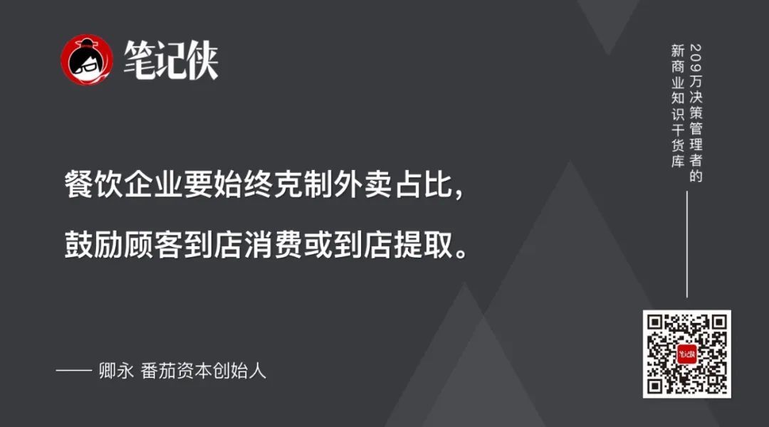 餐飲企業(yè)要不斷加大消費者外帶的比例,能降低服務(wù)面積、減少服務(wù)人力,從而降低投資成本、租金成本、服務(wù)成本,也不用產(chǎn)生平臺扣點、配送及買流量成本。