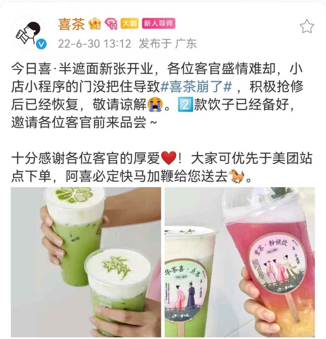 兩款茶飲一經開售,迅速在消費者間掀起購買熱潮,朋友圈、微博、小紅書等社交平臺隨處可見大家的打卡帖子,全國多地門店都出現(xiàn)了爆單的現(xiàn)象,部分門店還不得不短暫關閉在線點單功能。
