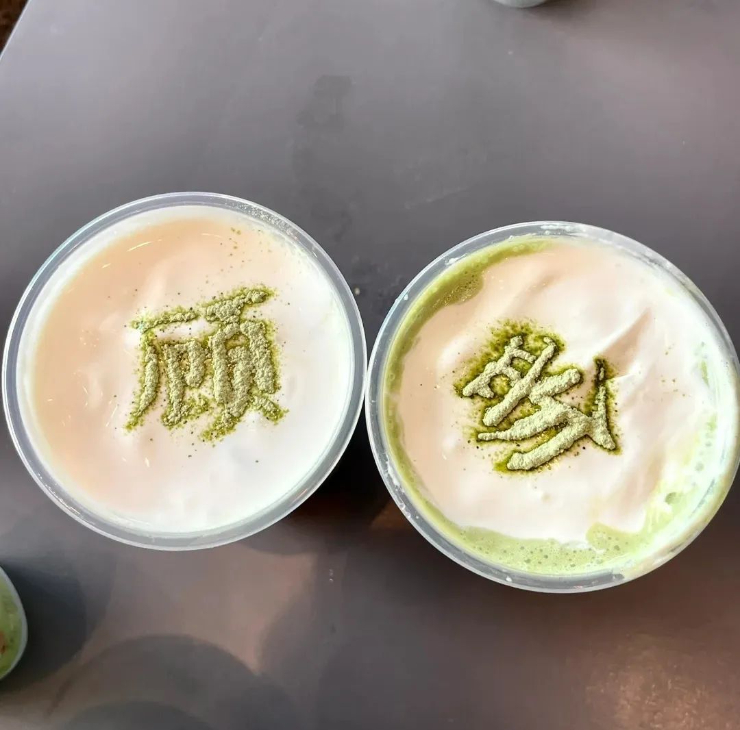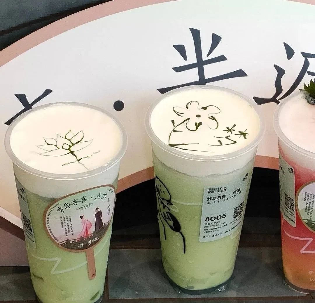 飲品頂部的芝士奶蓋上,有用抹茶粉“寫”成的聯(lián)名主題字樣和圖案,共有7款不同的樣式,分別為“顧”“盼”“夢”“遮”四個字,以及琵琶、花鈿、小扇子三種花樣,和劇中茶湯上作畫的“茶百戲”傳統(tǒng)技藝相呼應。