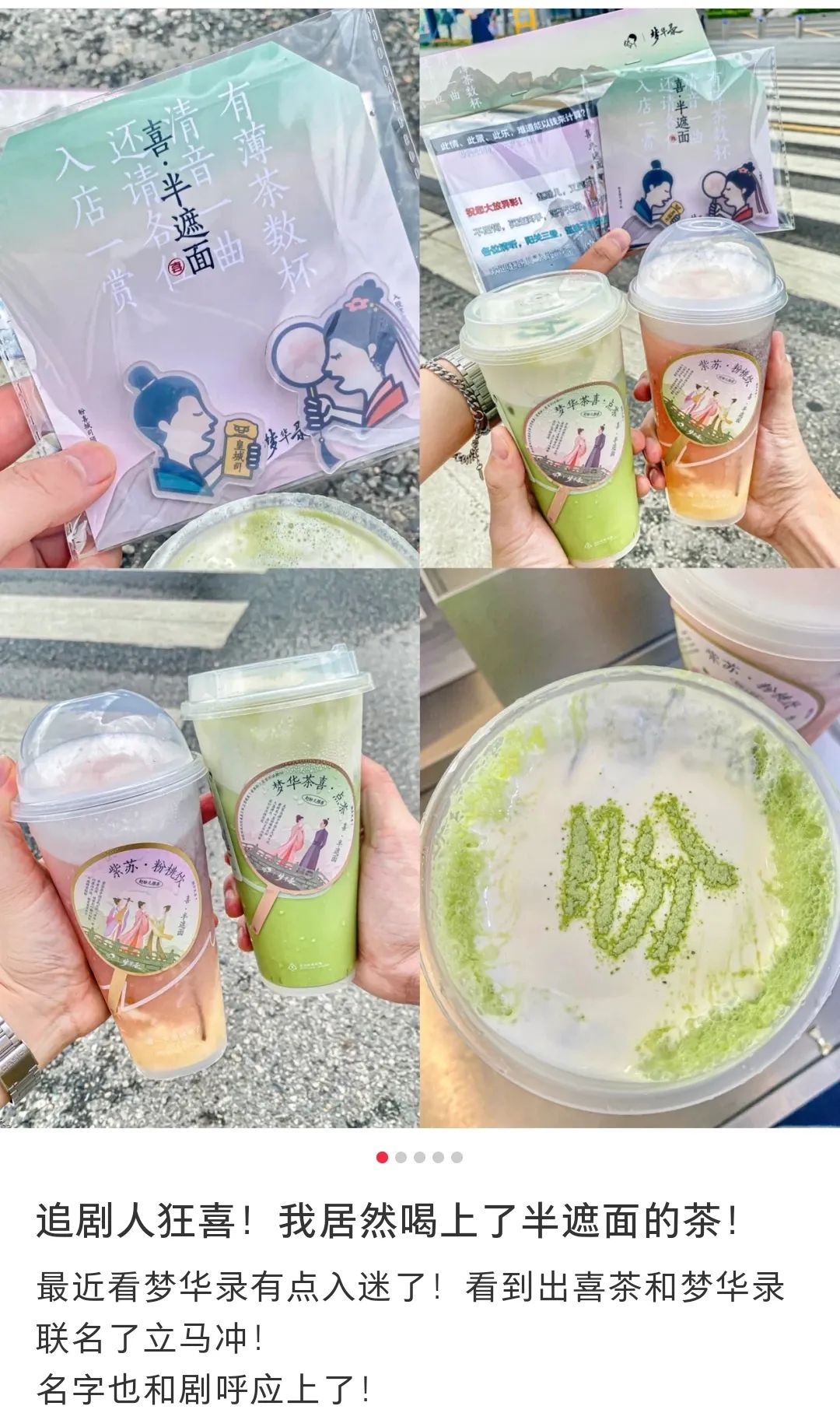 早在喜茶官宣聯(lián)名之前,就有觀眾、媒體等將兩個IP聯(lián)想到一起,《夢華錄》中趙盼兒開“半遮面”茶館的營銷方法,還被戲稱為“喜茶”套路。