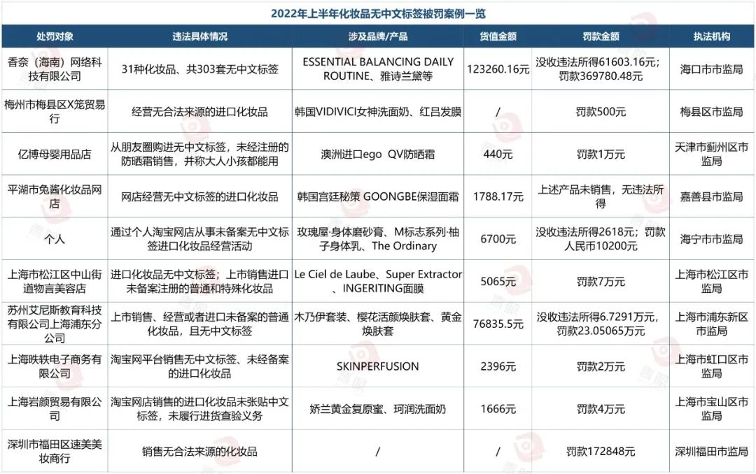 同時,青眼發(fā)現(xiàn),今年以來,已有20家企業(yè)或個人因經(jīng)營無中文標簽化妝品而被處罰的案件,最高罰款金額近74萬元。從線下到線上,全面堵截水貨化妝品。