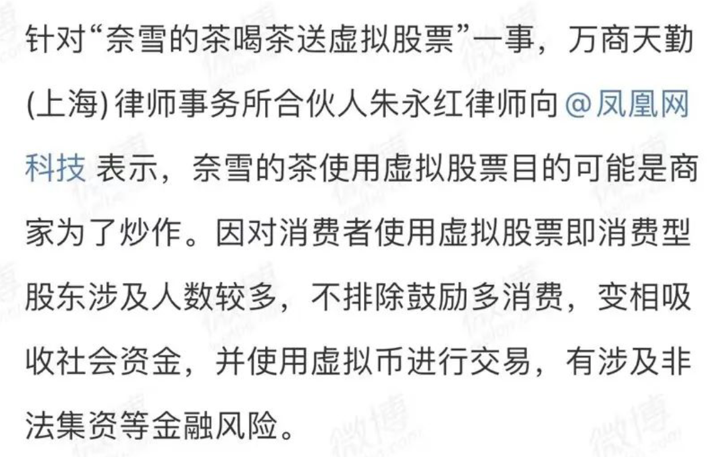 有律師判斷,這種虛擬股票會(huì)鼓勵(lì)用戶多消費(fèi),可能會(huì)有變相吸收社會(huì)資金的問題。而奈雪幣、奈雪虛擬股票也有涉及擅自發(fā)行證券,非法集資的風(fēng)險(xiǎn)。