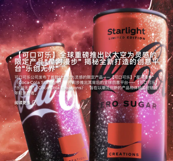 當(dāng)然,可口可樂(lè)面對(duì)的,并非全然是困局,在產(chǎn)品本身之外,也有諸多值得挖掘的。譬如說(shuō)在最近,可口可樂(lè)打造了以太空為靈感的限定產(chǎn)品「星河漫步」,甚至還連帶著開(kāi)發(fā)了創(chuàng)意平臺(tái)「樂(lè)創(chuàng)無(wú)限」。
