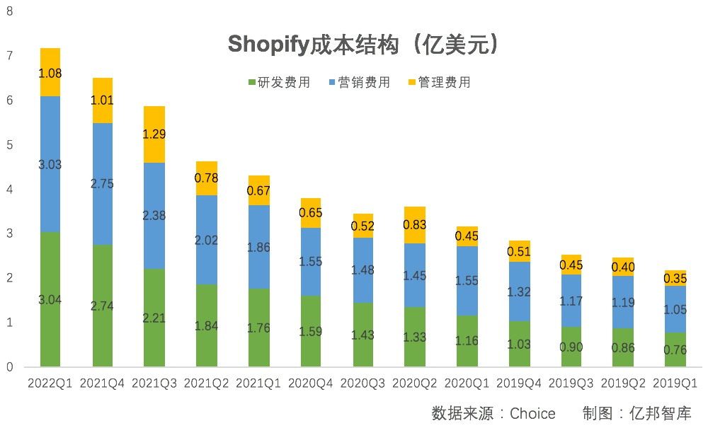 與此同時,Shopify2022年一季度凈利潤大幅虧損14.74億美元,主要由于營收下降,但研發(fā)費(fèi)用、營銷費(fèi)用和管理費(fèi)用慣性增長,導(dǎo)致凈利潤變差。