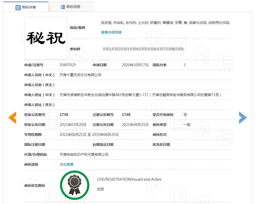 根據(jù)中國(guó)商標(biāo)網(wǎng)信息顯示,秘祝的第三類(lèi)商標(biāo)歸屬于天津十重?zé)o間文化有限公司,該商標(biāo)的注冊(cè)日期為2021年6月21日。十重?zé)o間的法定代表人為趙麗梅,董子初是該公司的監(jiān)事。