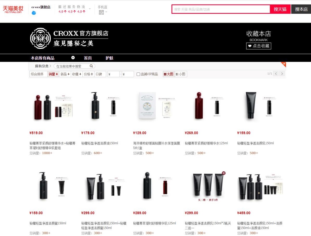 目前,秘祝的產(chǎn)品是在原來(lái)的CROXX天貓旗艦店中銷(xiāo)售,其中銷(xiāo)量最高的是秘藏菁萃精華水乳套組,月銷(xiāo)量為1000+件。董子初表示,之后將開(kāi)設(shè)秘祝品牌天貓旗艦店。