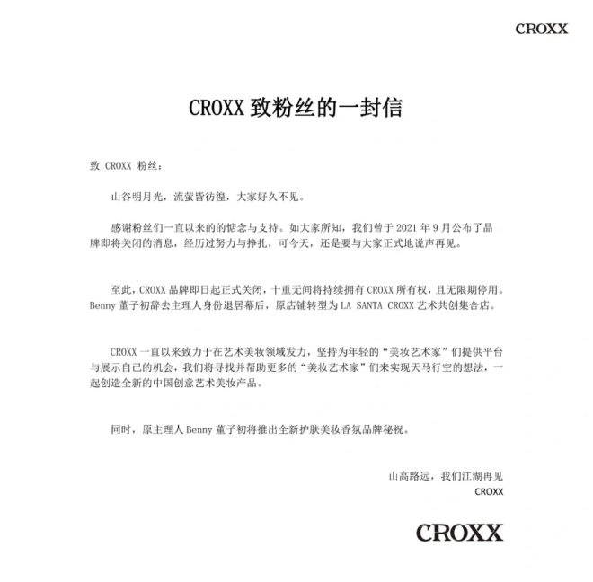不過(guò),CROXX只維持了短暫的風(fēng)光,2021年9月14日,品牌宣布即將退出市場(chǎng)。直至今年5月,該品牌正式關(guān)停。