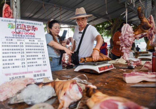 陳誠夫婦為拼多多直播間的網(wǎng)友選購?fù)霖i肉(攝影 張慧)
