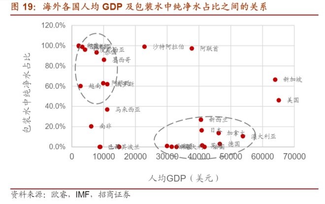 但從國內(nèi)市場過去的發(fā)展規(guī)律來看,盡管行業(yè)集中度高,過去10年2元水替代1元水,3元水切入市場依然是大勢所趨,這種集中度高的競爭局面并非不可打破;并且從國外市場帶來的經(jīng)驗來看——招商證券的研報曾分析,各國人均GDP水平和包裝水中純凈水占比相關(guān),除了個別國家,大部分人均GDP較低地區(qū)純凈水占比較高,人均GDP較高的國家,如日本、澳大利亞、德國、意大利等國家以天然礦泉水為主。