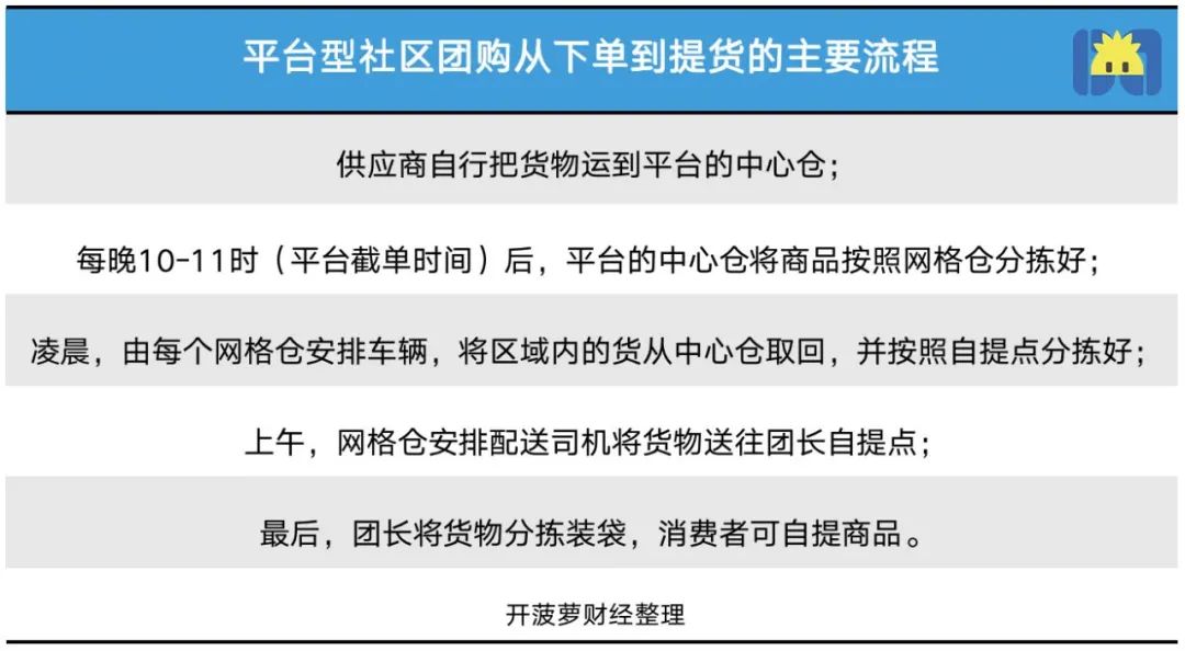 社區(qū)團(tuán)購平臺不參與商品的采購,相當(dāng)于一個“中介”。我們前一天在手機(jī)里下單,第二天就能到附近的自提點(diǎn)取貨,其間商品的流通過程是,中心倉-網(wǎng)格倉-自提點(diǎn)。