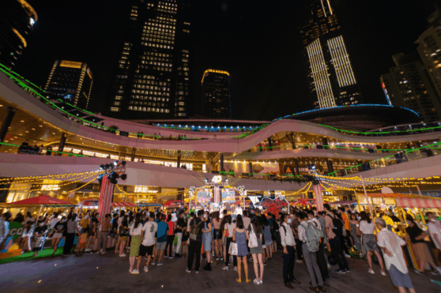 而商場除了利用購物中心之中的空間,打造夜生活街區(qū)、小巷,還將外部的廣場、天臺等作為大型夜市嘉年華的場地。