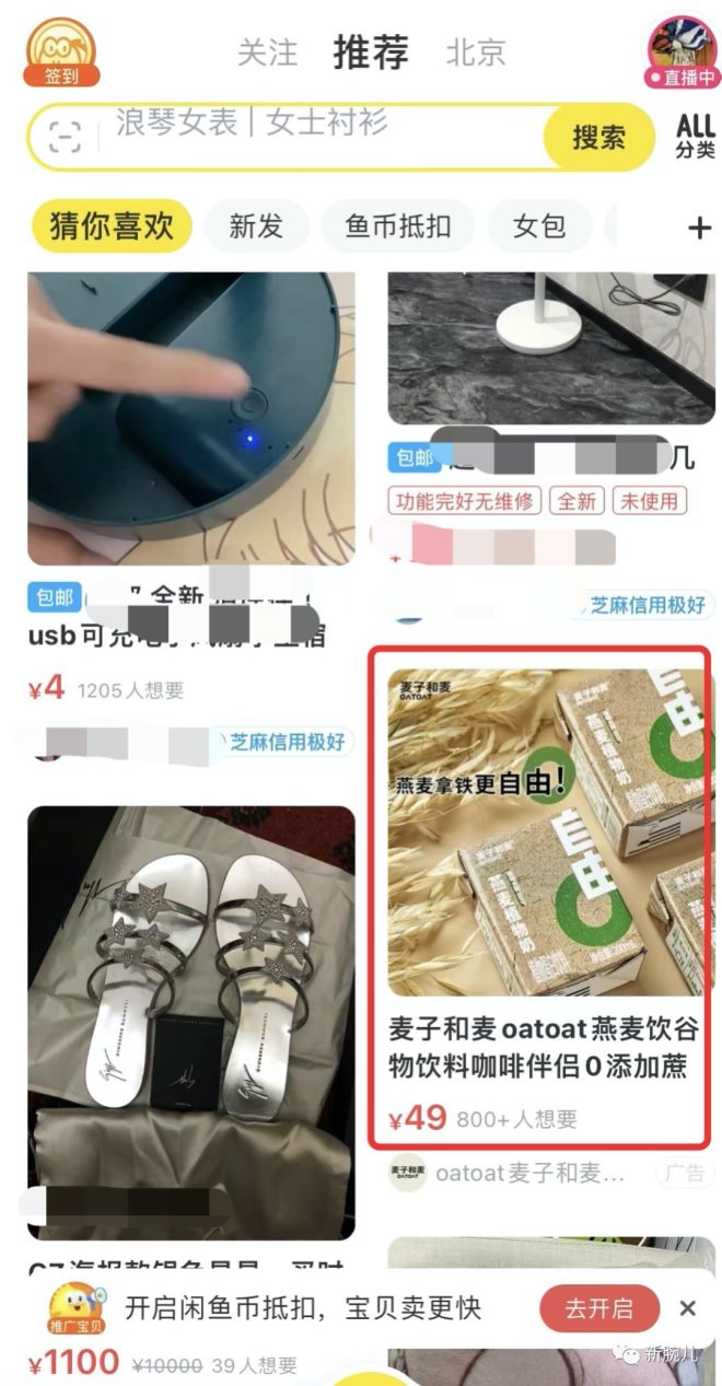 再看第三名的oatoat麥子和麥,付款人數(shù)1萬+。和歐扎克不同,oatoat麥子和麥沒有請明星代言,卻做了大量廣告投放。例如搜索過他們后,閑魚算法會推薦oatoat麥子和麥廣告。