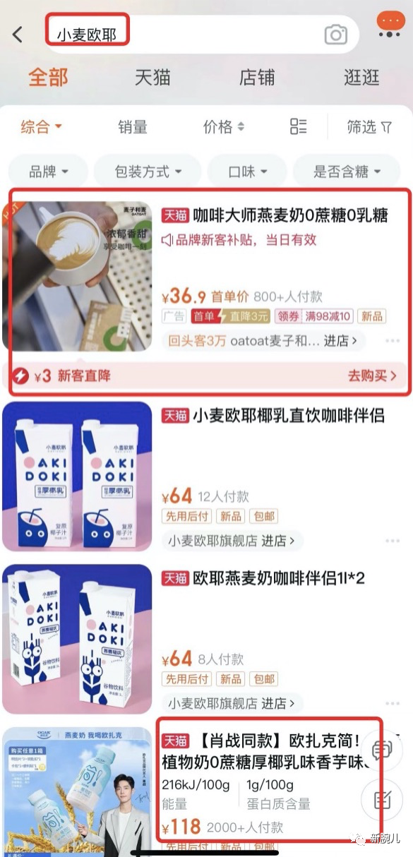 在淘寶上搜索小麥歐耶,最先出現(xiàn)的卻是oatoat麥子和麥,第三名出現(xiàn)了歐扎克。