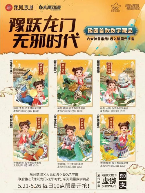 豫園商城則特別聯(lián)合復星影文推出首個國風虛擬數字偶像秦佑之作為“星意官”,將遠方的星意帶給千家萬戶的同時,還攜手大禹動漫、UOVA蛋殼宇宙在“虛獼SHOWAPE”平臺線上發(fā)售首款NFT數字藏品系列《豫躍龍門·無邪時代》,基于自身豐富的文化積淀并賦予豫園六對鎮(zhèn)宅神獸數字化生命,帶領熱愛探索的年輕人步入一場奇幻探索之旅。