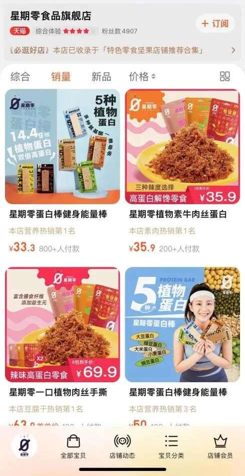現(xiàn)實是,數(shù)據(jù)騙不了人。筆者觀察到,星期零淘寶旗艦店銷售最好還是蛋白棒這樣的健身食品與辣條制品,其中與必品閣聯(lián)名的植物肉水餃只有2的銷量。