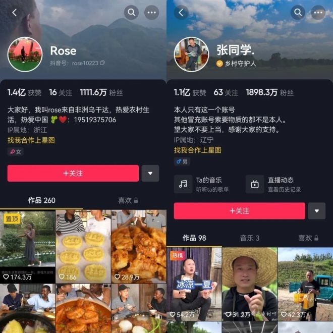 隨后,帥農(nóng)鳥哥席卷B站熱榜,被B站網(wǎng)友稱為“六邊形戰(zhàn)士版李子柒”,短短11天漲粉100萬。嫁到中國的非洲媳婦Rose,憑借拍攝制作各類中國鄉(xiāng)村美食,在抖音吸粉千萬,也被不少人稱作“非洲李子柒”。