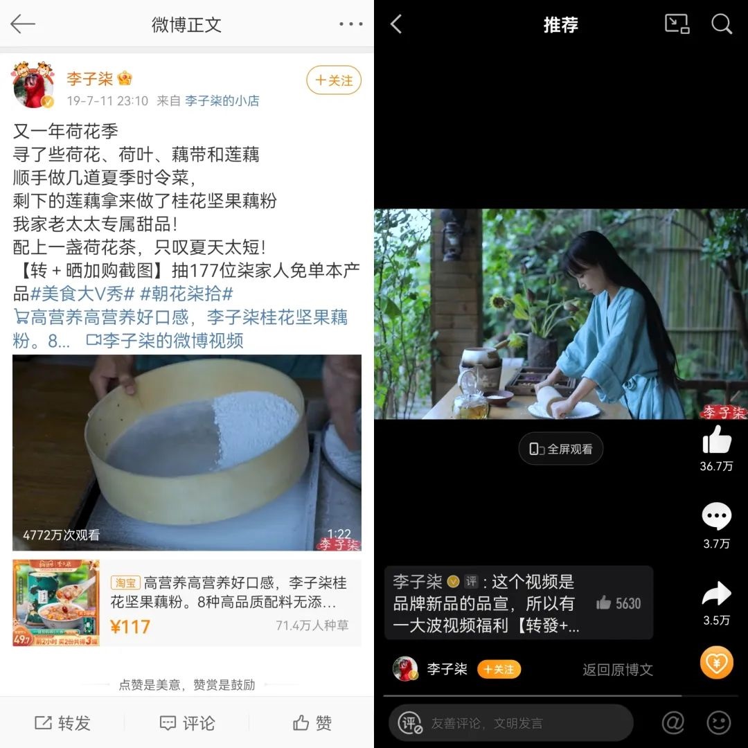 另一方面,即使在有了自己的品牌之后,李子柒的視頻中也沒有過多露出自己品牌的商品,更多還是在專心做內(nèi)容,走的是內(nèi)容和商業(yè)分離的變現(xiàn)道路。