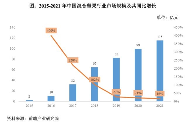 前瞻產(chǎn)業(yè)研究院調(diào)研,我國(guó)混合堅(jiān)果行業(yè)2015-2021年市場(chǎng)規(guī)模整體保持較快增長(zhǎng)的態(tài)勢(shì);2020年我國(guó)混合堅(jiān)果行業(yè)市場(chǎng)規(guī)模約為99億元,同比增長(zhǎng)21%;2021年我國(guó)混合堅(jiān)果行業(yè)市場(chǎng)規(guī)模約為115億元,同比增長(zhǎng)16%。