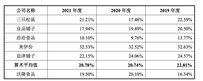 不過(guò)在整體毛利率上,沃隆食品近兩年來(lái)高出同行。招股書(shū)顯示,2019年—2021年,沃隆食品毛利率分別為33.53%、37.16%、38.01%,連年上升,同期行業(yè)平均毛利率分別為35.93%、34.49%、33.47%。