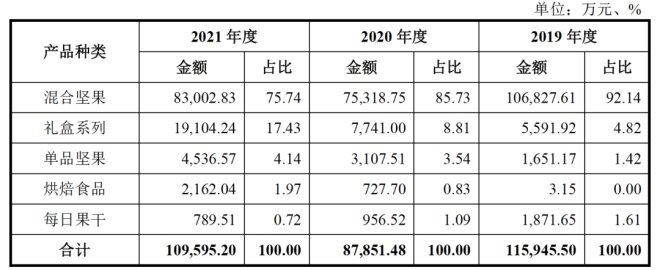沃隆食品十分依賴混合堅(jiān)果。據(jù)招股書(shū)顯示,2019年至2021年,沃隆食品混合堅(jiān)果銷售收入占總收入的92.14%、85.73%、75.74%,雖收入占比逐年下滑,但仍為沃隆食品核心收入來(lái)源。