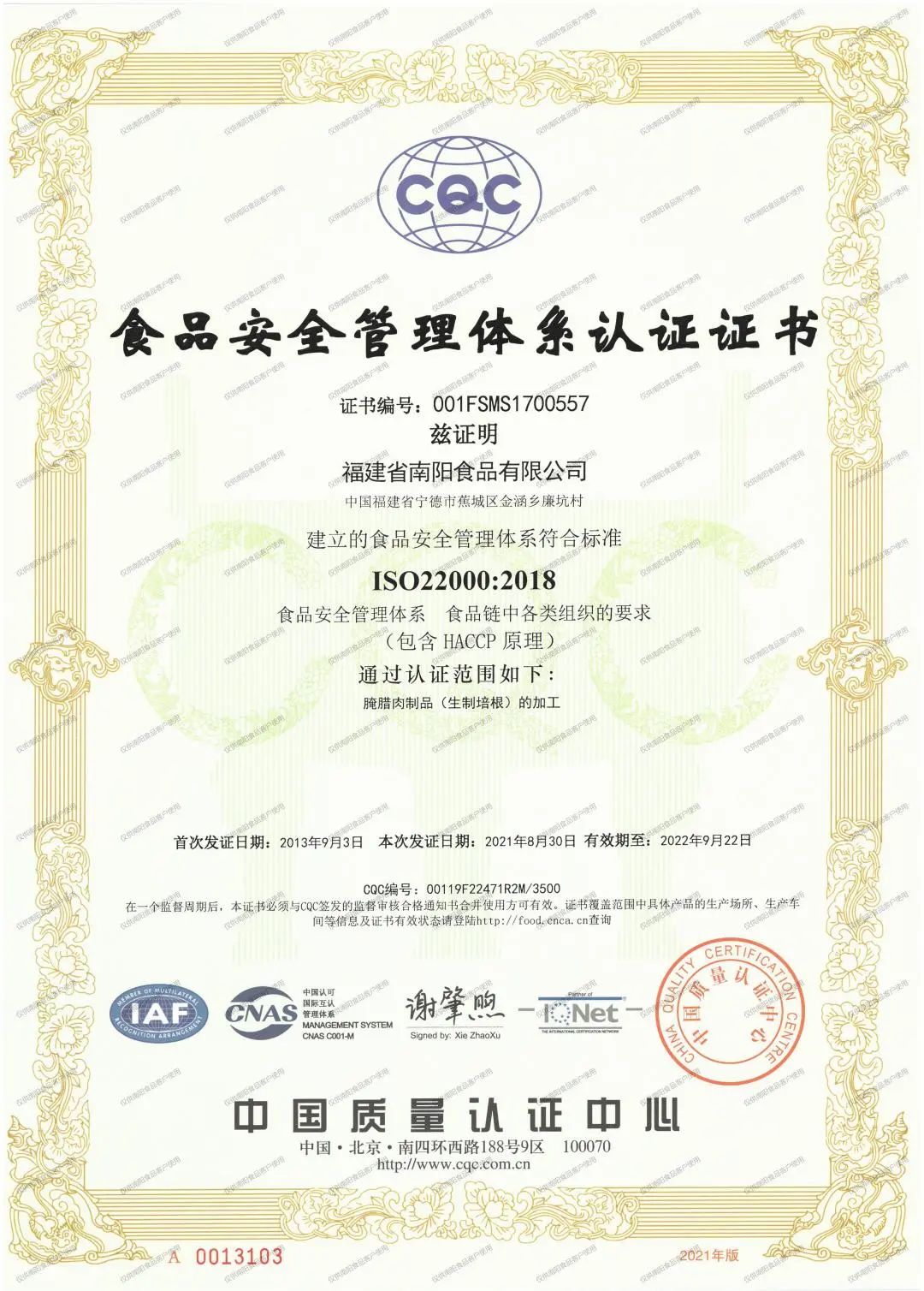 福建省南陽食品有限公司位于福建省寧德市,是南陽實(shí)業(yè)集團(tuán)旗下11個(gè)實(shí)體成員企業(yè)之一,占地58畝,擁有員工600多人,高標(biāo)準(zhǔn)廠房4.3萬㎡,冷庫容量2萬噸,引進(jìn)德國、西班牙、臺(tái)灣等世界先進(jìn)的食品加工設(shè)備和生產(chǎn)工藝。公司一直堅(jiān)持豬肉產(chǎn)業(yè)鏈,健康好品質(zhì)經(jīng)營理念,年提供培根、火腿、丸類、腸類、扒類等產(chǎn)品。公司通過了ISO9001:2015國際質(zhì)量標(biāo)準(zhǔn)認(rèn)證、HACCP食品安全認(rèn)證和QS認(rèn)證。榮獲全國農(nóng)產(chǎn)品加工示范企業(yè)、全國農(nóng)產(chǎn)品主食加工企業(yè)、中國豬業(yè)全產(chǎn)業(yè)鏈?zhǔn)褬?biāo)桿企業(yè)、中國十佳冷鮮肉生產(chǎn)企業(yè)。