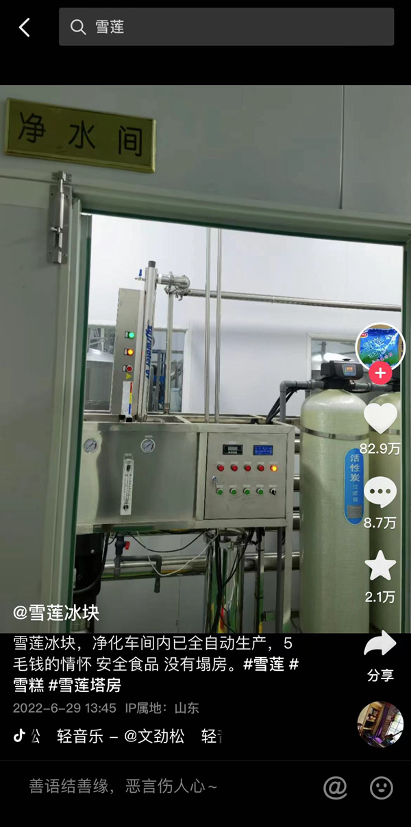 對(duì)此,6月29日,“雪蓮冰塊”連夜注冊(cè)賬號(hào)進(jìn)行回應(yīng),發(fā)布了自己生產(chǎn)車(chē)間的照片,并配文道:“雪蓮冰塊,凈化車(chē)間內(nèi)已全自動(dòng)生產(chǎn),5毛錢(qián)的情懷,安全食品,沒(méi)有塌房。”