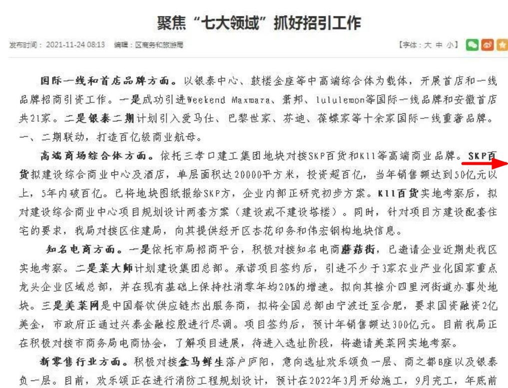 2021年11月,在廬陽區(qū)商務和旅游局發(fā)布的“聚焦‘七大領(lǐng)域’抓好招引工作”消息中提及,將依托三孝口建工集團地塊對接SKP百貨和K11等高端商業(yè)品牌。且消息更明確了彼時已經(jīng)將地塊圖紙報給SKP方,企業(yè)內(nèi)部正研究初步方案,項目計劃打造綜合商業(yè)中心及酒店,單層面積達2萬方,投資超百億。