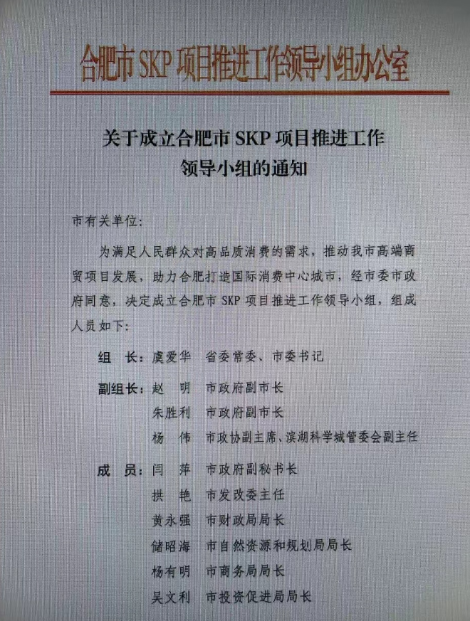 近日,一份“關(guān)于成立合肥市SKP項目推進工作領(lǐng)導小組的通知”文件在網(wǎng)絡曝光并廣泛傳播。文件中明確:為滿足人民群眾對高品質(zhì)消費的需求,推動合肥高端商貿(mào)項目發(fā)展,助力合肥打造國際消費中心城市,決定成立合肥市SKP項目推進工作領(lǐng)導小組。