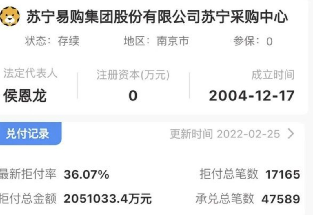 通過天眼查數(shù)據(jù)顯示,蘇寧易購面臨著130多起民事訴訟。其中多數(shù)是票據(jù)糾紛,也就是商票的拒付案件。本次發(fā)起破產(chǎn)清算申請的兩家蘇寧供應(yīng)商一樣。最新的拒付率高達(dá)36%,違約比率也是相當(dāng)高的。