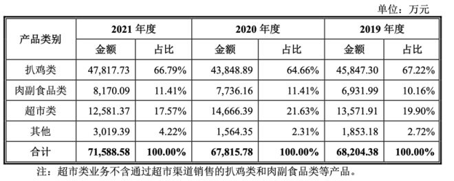 德州扒雞的收入主要來自扒雞類產(chǎn)品。具體來看,2019年—2021年來自扒雞類產(chǎn)品的收入分別為4.58億元、4.38億元和4.78億元,占主營(yíng)業(yè)務(wù)收入的比例分別為67.22%、64.66%和66.79%。