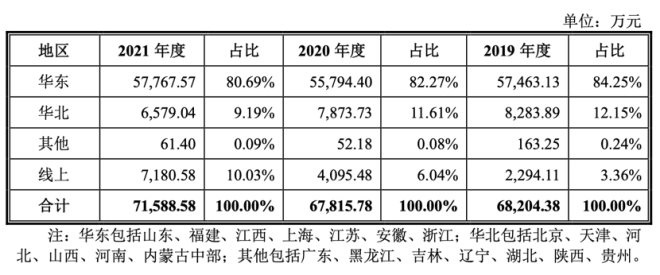 從地域來看,德州扒雞有超過八成的收入來自華東地區(qū)(包括山東、福建、江西、上海、江蘇、安徽、浙江)。報(bào)告期內(nèi),華東地區(qū)的收入分別為5.75億元、5.58億元和5.78億元,占比分別為84.25%、82.27%和80.69%。