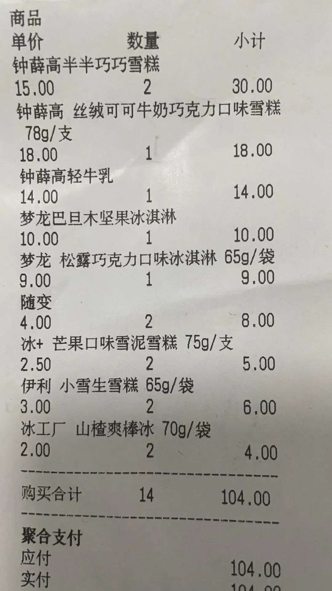 首先,這次鐘薛高是實(shí)實(shí)在在出了圈。在撰寫《鐘薛高是怎么得罪了年輕人的?》一文時(shí),為了更更加客觀的了解到鐘薛高這次為何會(huì)引起如此大的爭(zhēng)議,駝鹿新消費(fèi)曾在京東便利店調(diào)研,并購(gòu)買了包括鐘薛高、夢(mèng)龍、隨變等多個(gè)品牌共計(jì)14支雪糕,共計(jì)花費(fèi)104元。在打印小票時(shí),旁邊另一名售貨員看到售貨機(jī)上顯示的付款金額時(shí),脫口而出“這么貴,你買了鐘薛高了吧?”。