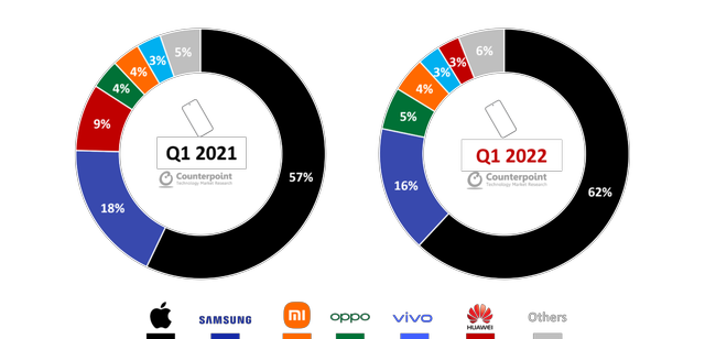 Counterpoint公布的數(shù)據(jù)顯示,2022年Q1,全球高端智能手機(jī)(約人民幣2680元以上)中,OPPO和vivo分別均占據(jù)5%和3%的市場份額,相較一年前,幾乎沒有變化。作為對比,蘋果的市場份額為62%,同比增長5%。