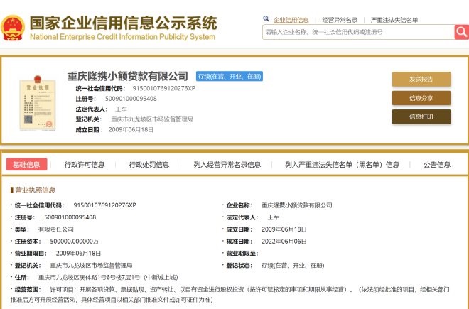 2022年6月28日,重慶隆攜小額貸款有限公司(下文簡稱為“隆攜小貸”)發(fā)生工商變更,注冊資本增加至50億元。自此,隆攜小貸成為業(yè)內(nèi)第十家注冊資本達(dá)50億元規(guī)模的網(wǎng)絡(luò)小貸公司。