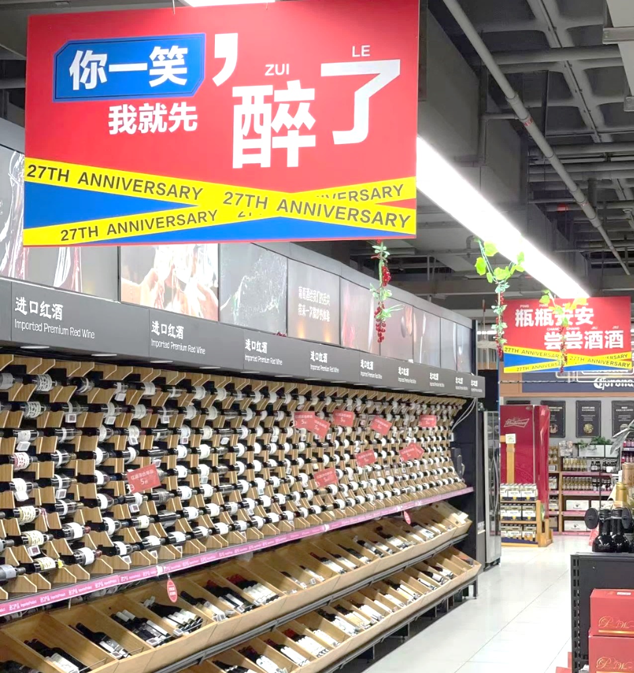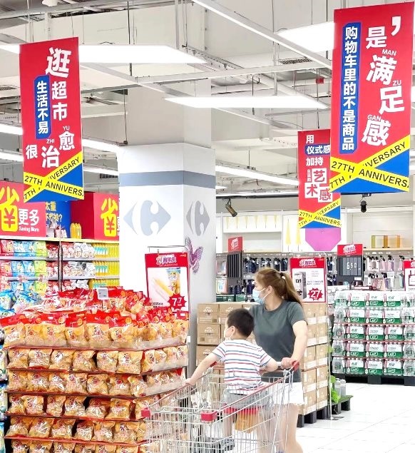 最近,在上海家樂福古北店,一道道帶有“27th Anniversary”標(biāo)志的吊板,亮眼醒目,上面詼諧趣味的文字,吸引了不少消費(fèi)者駐足細(xì)讀!胺攀罴倭藥∨笥褋砉涑,他看到這個(gè)很起勁”,消費(fèi)者李女士表示,“文字內(nèi)容都很有生活氣息,蠻有意思,是逛超市的氛圍”。